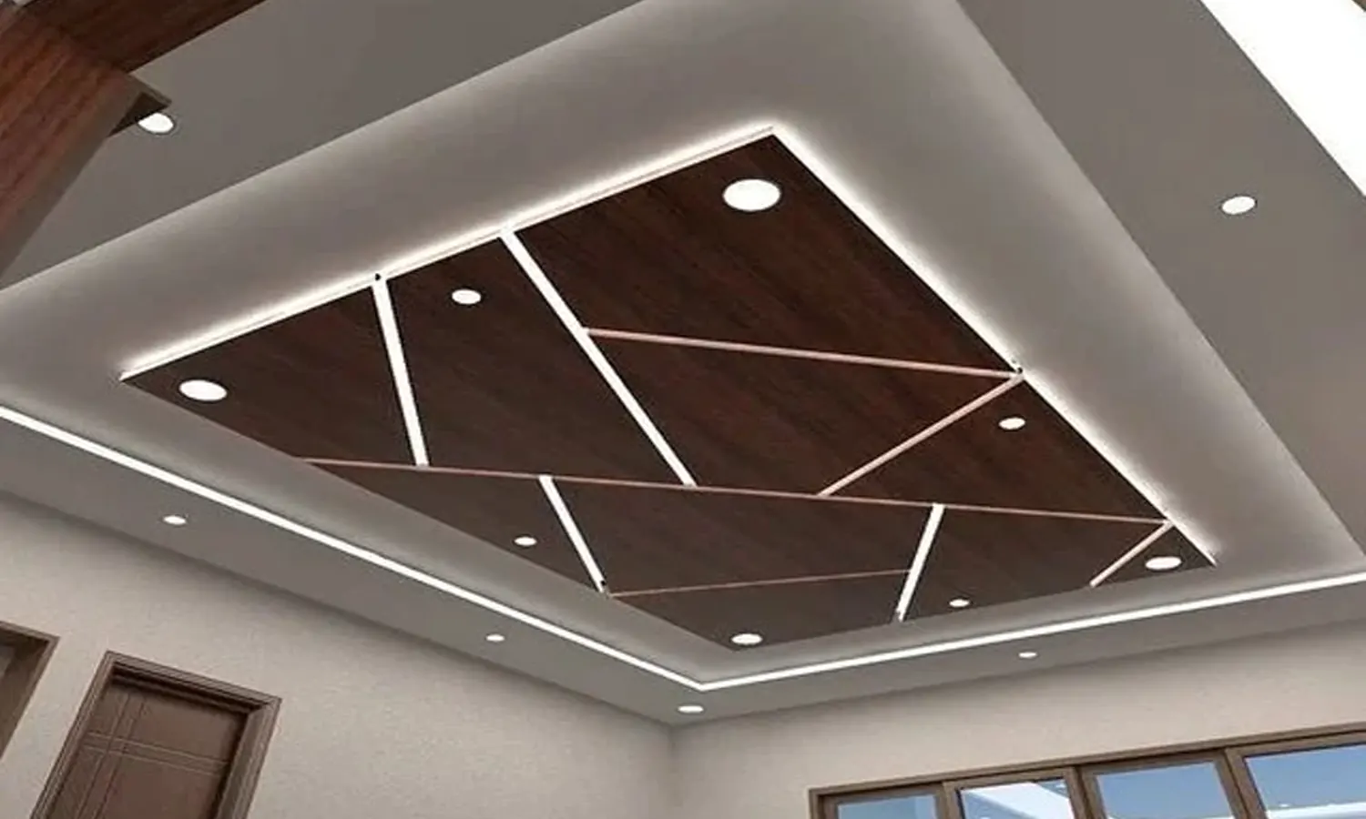 Model plafon PVC rumah minimalis yang satu ini memunculkan geometri sehingga menjadi langit-langit rumah terlihat indah.