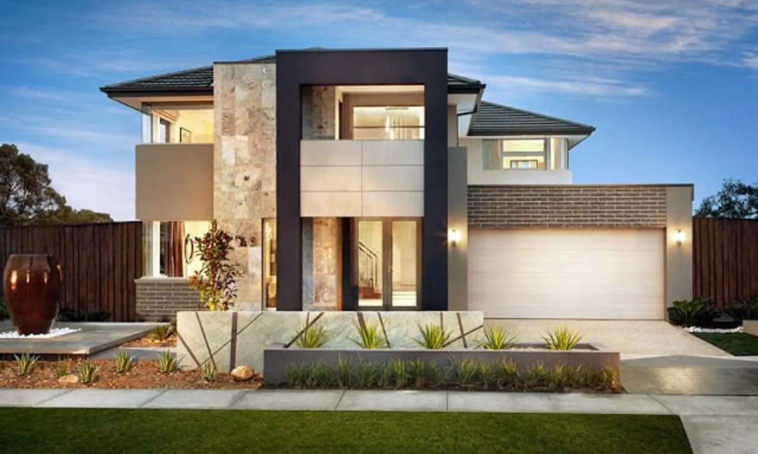 Kamu bisa membuat sebuah rumah mewah minimalis yang dipadukan dengan go-green seperti gambar di atas. Desain rumah dibuat simpel tetapi memasukkan unsur kayu dan bebatuan pada ornament dindingnya. Jangan lupa juga untuk menambahkan tanaman hias gantung di beberapa sisi dinding rumah.