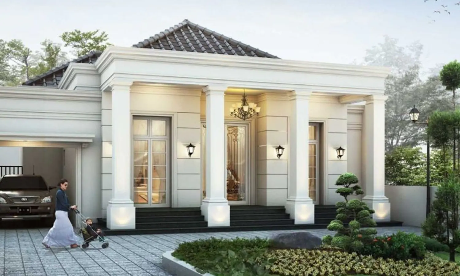Meletakkan lampu gantung pada model teras rumah klasik bisa menjadi langkah tepat. Apalagi jika Kamu memilih lampu gantung kristal putih untuk memperkuat aksen teras klasik modern, maka karakter teras klasik akan semakin kuat.