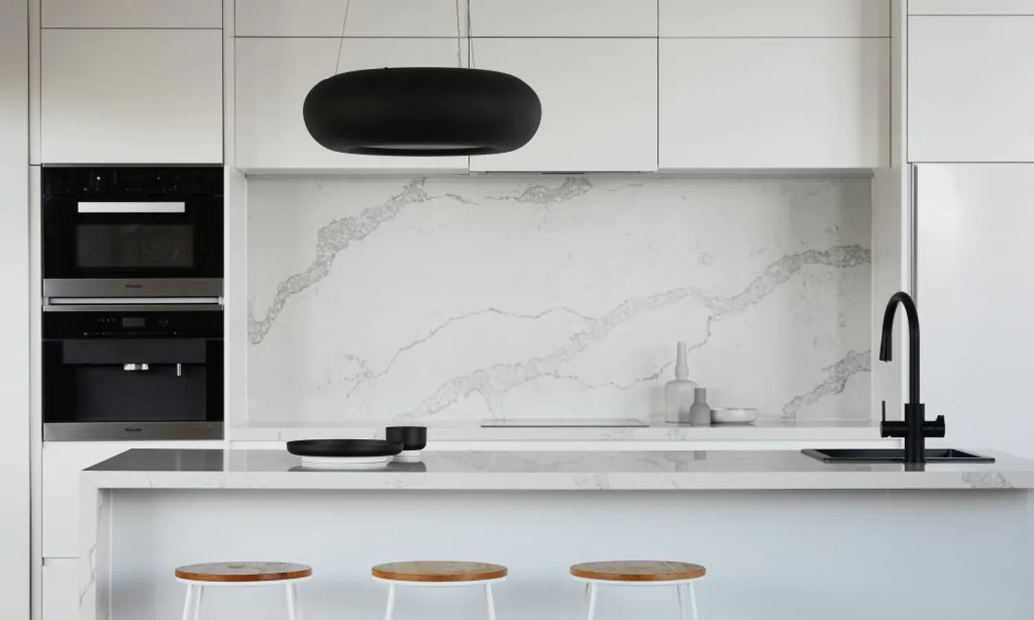 Lalu, kamu bisa tambahkan kabinet dapur berwarna gelap untuk memberikan kesan yang elegan, seperti gambar diatas.