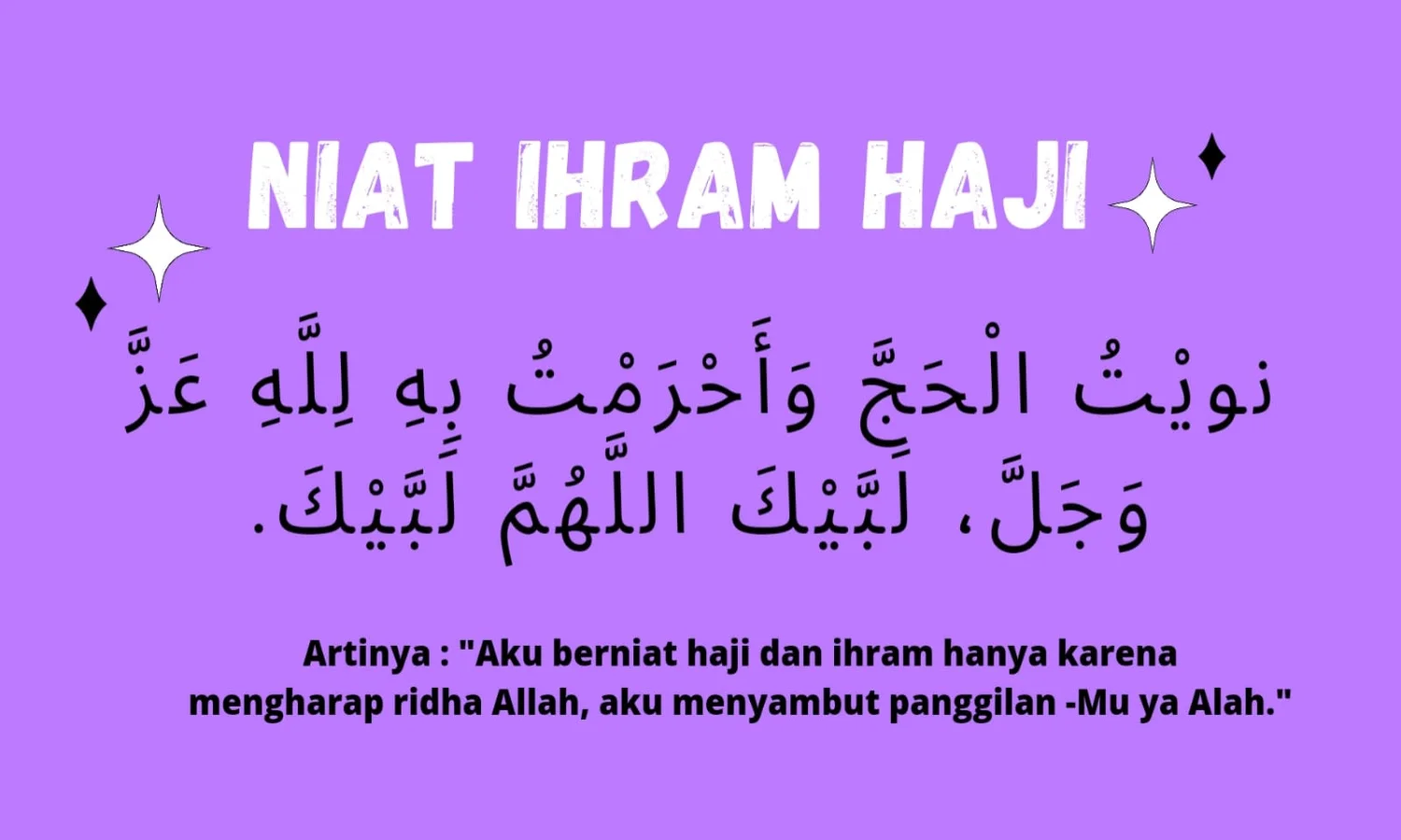 Artinya: "Aku berniat haji dan ihram hanya karena mengharap ridha Allah, aku menyambut panggilan-Mu ya Allah, aku menyambut panggilan-Mu."