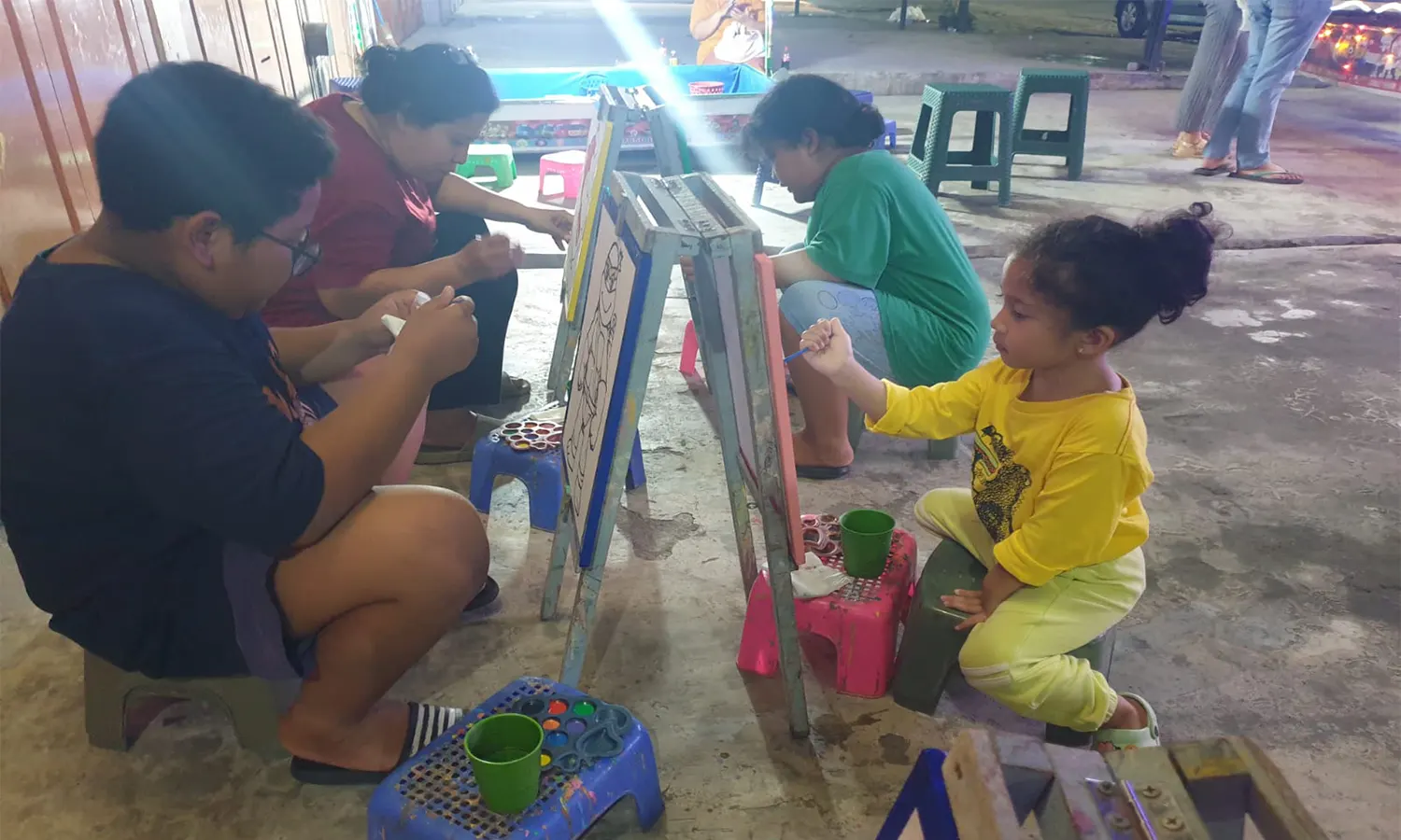Malam itu, ada sekitar 12 anak yang menikmati hiburan di arena permainan ini. Bahkan, beberapa orang tua juga terlena memainkan permainan. Baik yang melukis maupun menangkap ikan menemani anaknya bermain.
