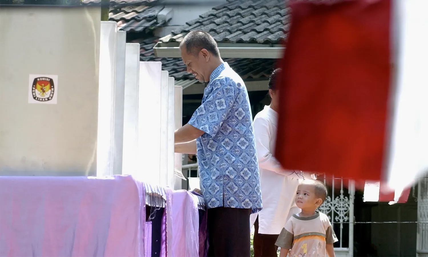 Jarak rumahnya ke TPS cuma sekitar 50 meter. Mudjono mengenakan kemeja putih padu padan celana drill cokelat, dan bersendal jepit. Kakinya melengos masuk bilik suara jam 11 siang.