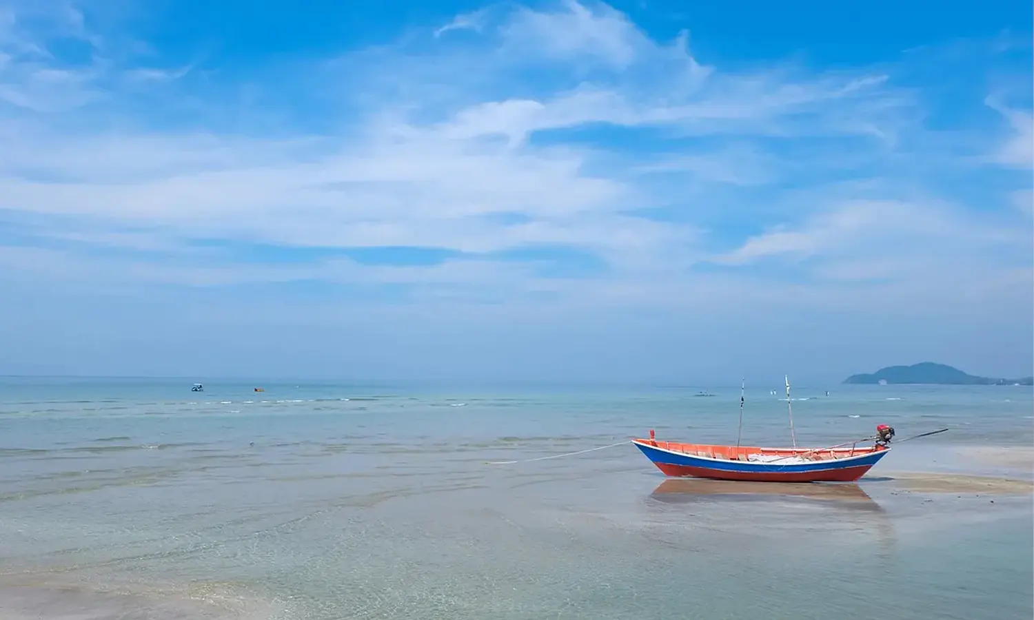 Di Pantai Pelangi, kamu bisa mengagumi keindahan alam sekitar dengan cara naik perahu mengelilingi pantai.