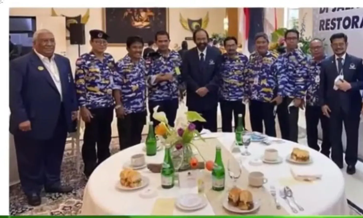 sebuah foto menampilkan sejumlah pejabat Eselon I Kementan mengenakan seragam Kostranas Partai NasDem saat berfoto dengan Paloh dan Mentan yang juga merupakan kader NasDem, Syahrul Yasin Limpo, di acara HUT ke-10 NasDem, pada Senin (15/11).