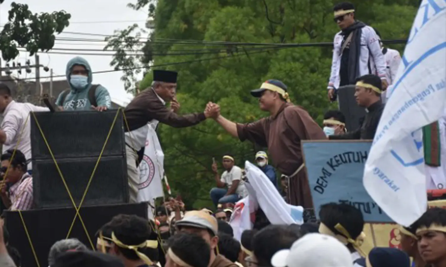 Namun di tengah lautan massa yang mengenakan ulos dan atribut perjuangan, pemandangan berbeda tampak mencolok.