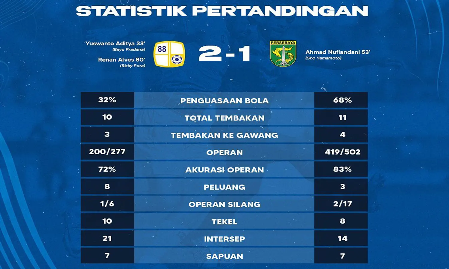 Dua gol tuan rumah diciptakan oleh Yuswanto dan Renan Alves. Sementara itu, satu-satunya gol balasan Persebaya dicetak oleh Ahmad Nufiandani.