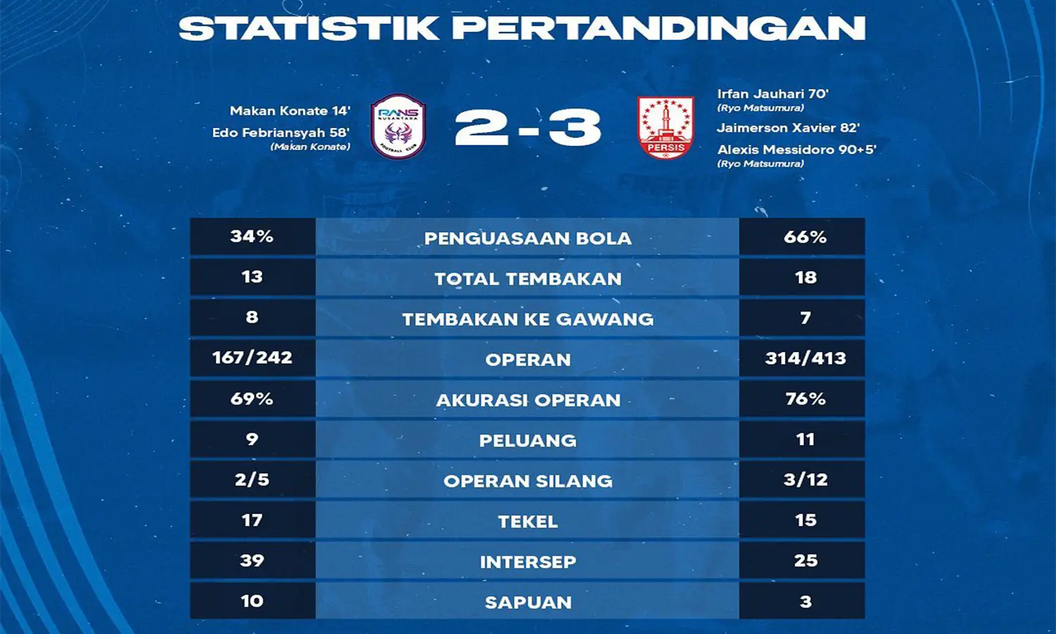 Gol-gol RANS dicetak oleh Makan Konate dan Edo Febriansah, sementara gol Persis dihasilkan oleh Irfan Jauhari, Jaime Xavier, dan Alexis Messidoro.