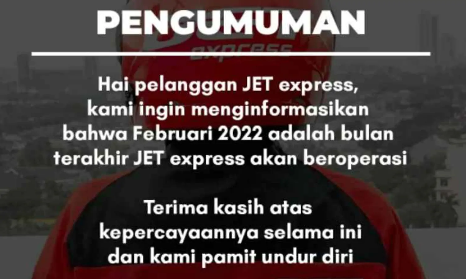 “Hai pelanggan JET express, kami ingin menginformasikan bahwa Februari 2022 adalah bulan terakhir JET express akan beroperasi,” tulis manajemen JET Express di laman resmi perusahaan.