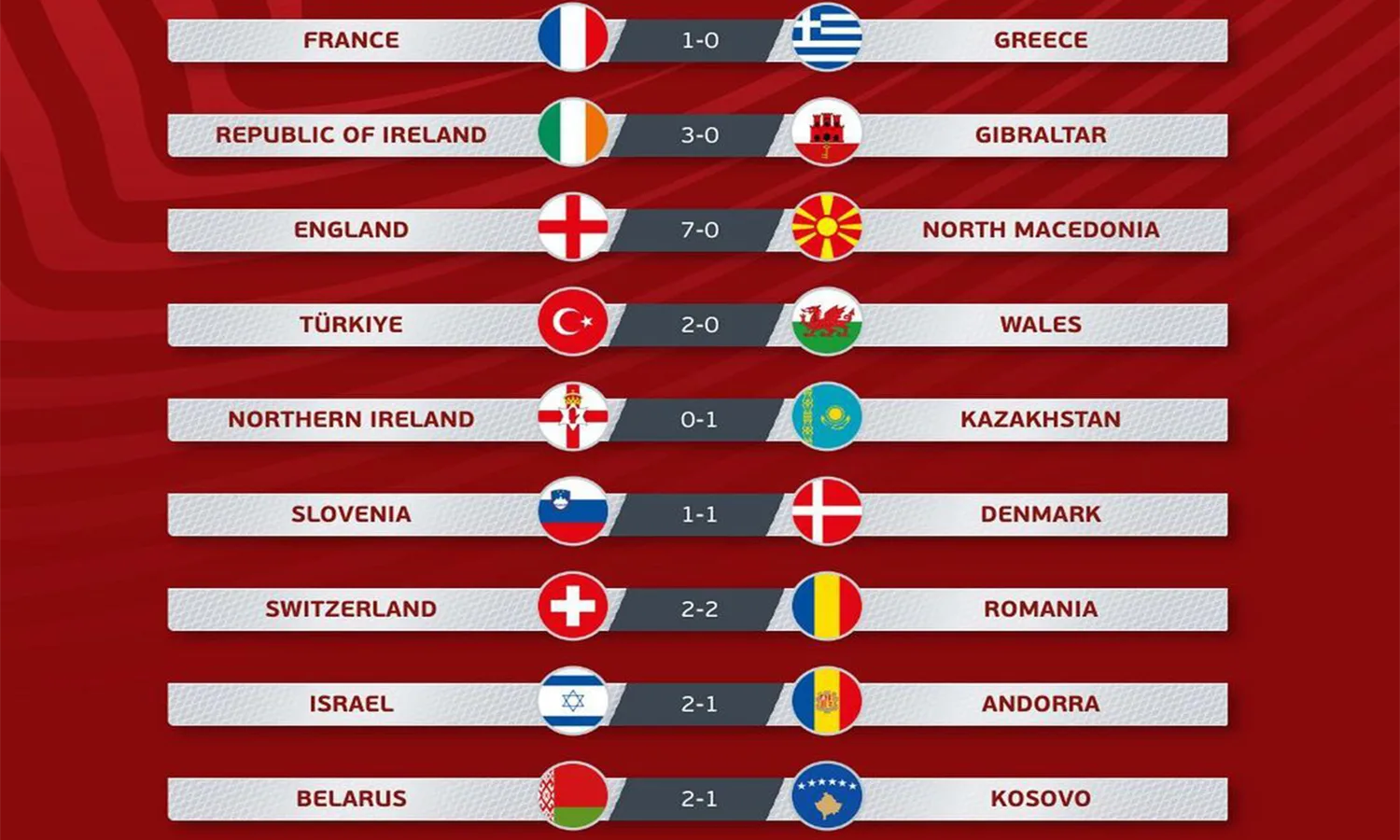 Timnas Prancis juga tetap mempertahankan performa sempurna di Grup B, mengoleksi 12 poin setelah meraih empat kemenangan beruntun. Mereka unggul enam poin atas Yunani yang berada di posisi kedua.
