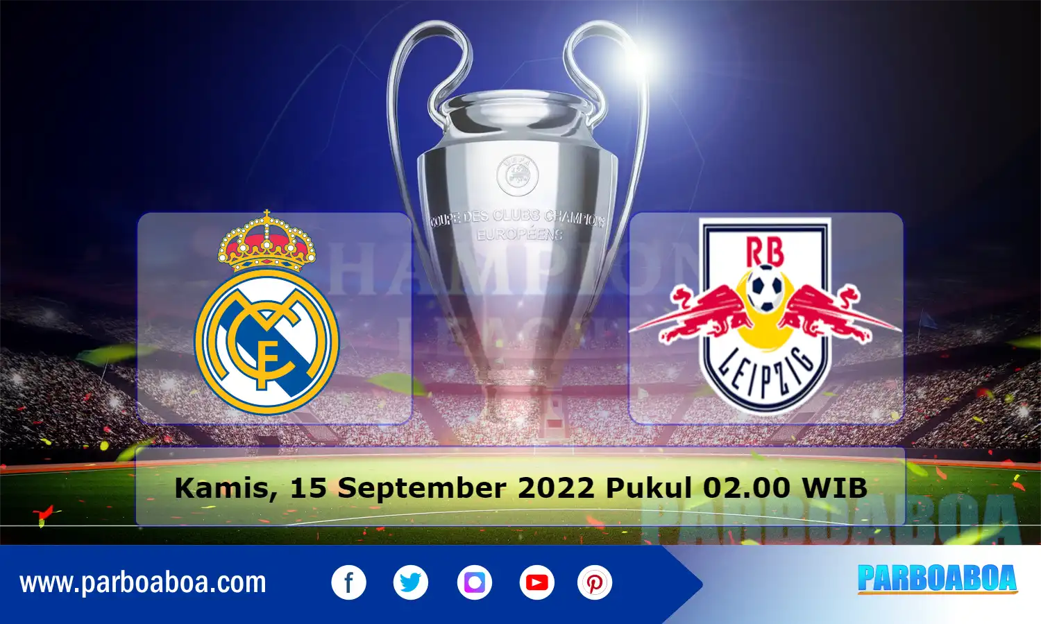 PARBOABOA – Juara bertahan Real Madrid akan ditantang RB Leipzig pada matchday 2 Grup F Liga Champions 2022/2023. Pertandingan UEFA Champions League (UCL) di Santiago Bernabeu ini dijadwalkan kick-off Kamis 15 September 2022, jam 02:00 WIB.