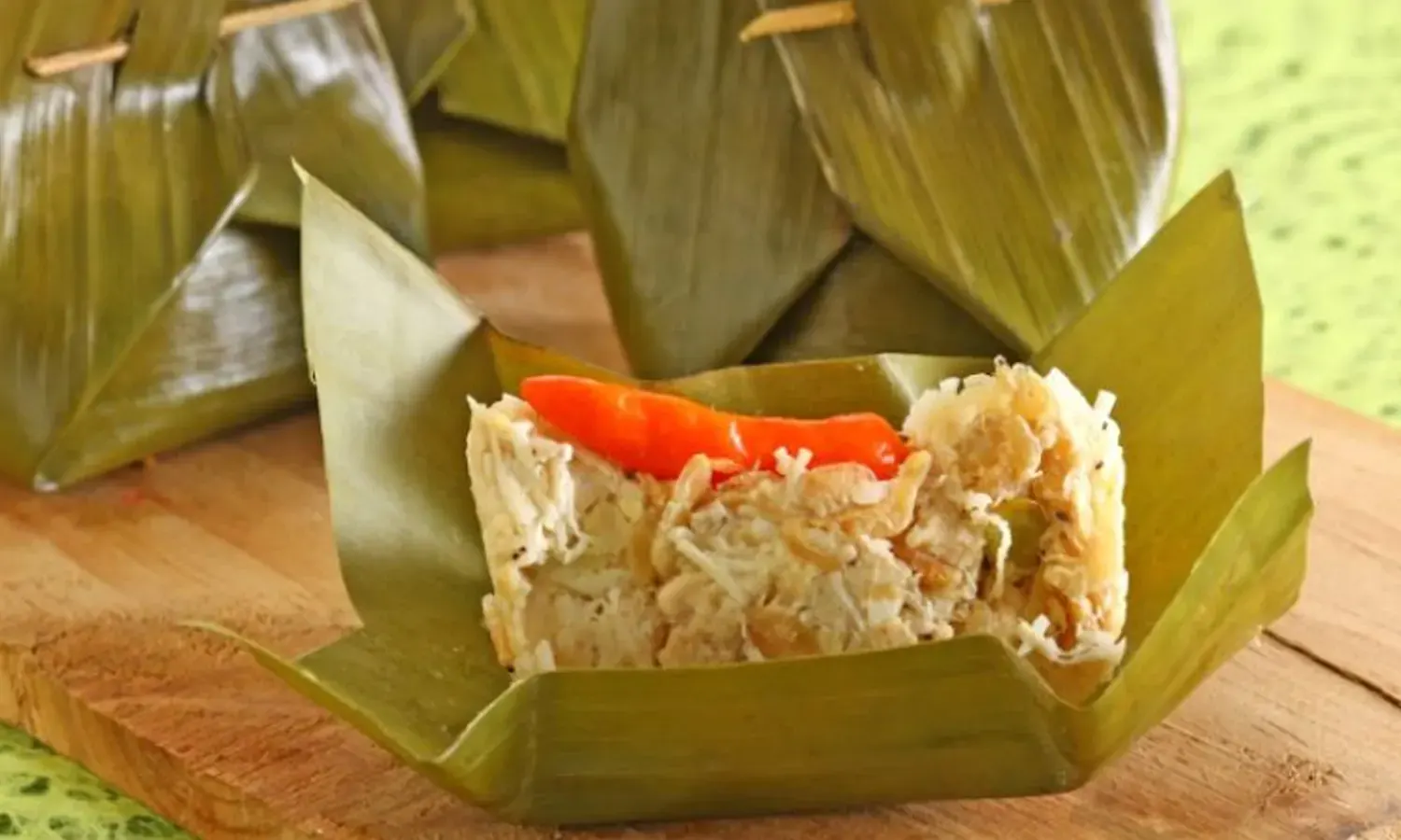 - Ambil selembar daun pisang atau pisang, letakkan 2 sendok sayur campuran di atasnya. Lipat daun pisang atau pisang sehingga campuran terbungkus rapi.