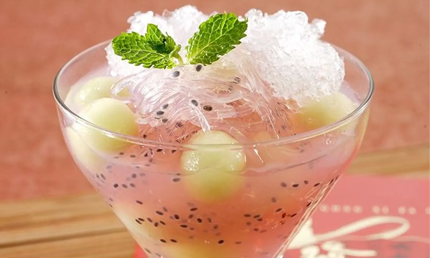 5. Campur buah melon, nata, kiwi, parutan agar, sirup, air, dan es batu kedalam wadah besar.