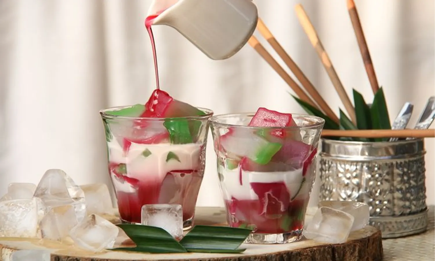 9. Penyelesaian: Tata selendang mayang dalam gelas saji. Tuang kuah santan dan saus gula. Beri es batu. Siap disajikan.