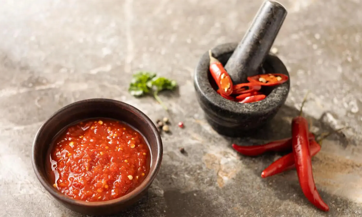 - Haluskan cabai rawit, cabai merah besar, bawang putih, garam, dan gula pasir dengan menggunakan blender atau ulekan.