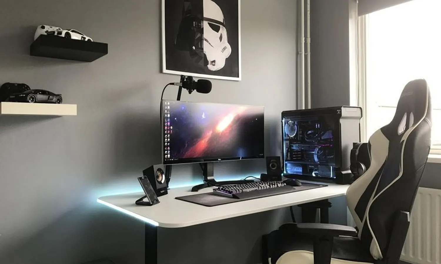 Pemilihan skema ruangan yang didominasi warna gelap memang terkesan tricky. Namun dengan sentuhan penataan lampu LED pada meja putih, konsep ruang gaming sederhana akan memancarkan kesan ruangan bak dunia lain. Gimana? Keren bukan?