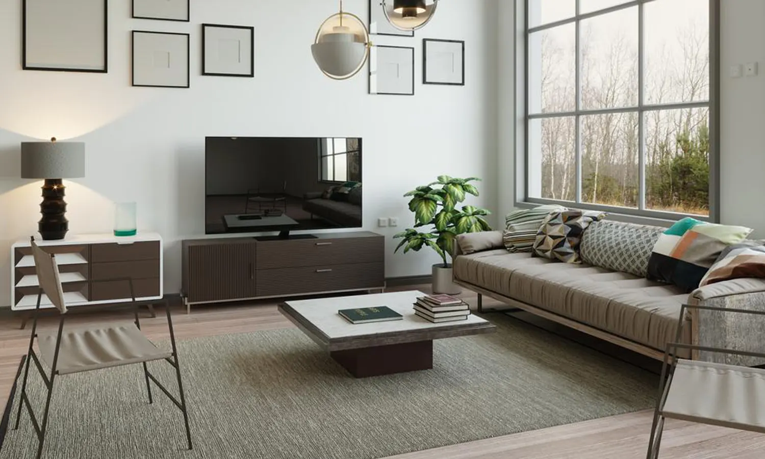Gaya modern minimalis identik dengan garis-garis yang bersih dan skema warna yang sederhana untuk desain ruang keluarga.