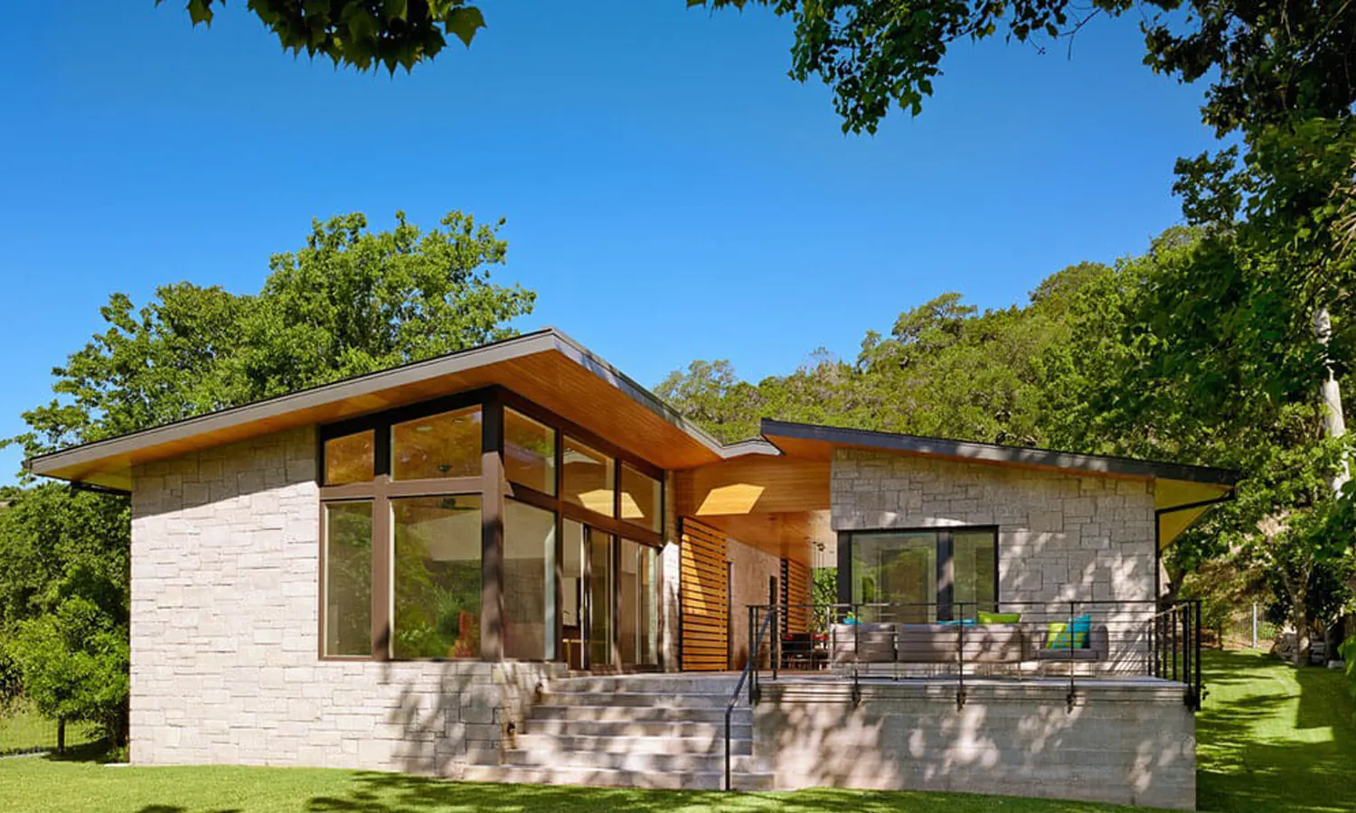 Desain rumah batu alam sederhana yang satu ini menggunakan batu alam dengan permukaan yang dibentuk menggunakan cairan asam atau yang dipoles halus.