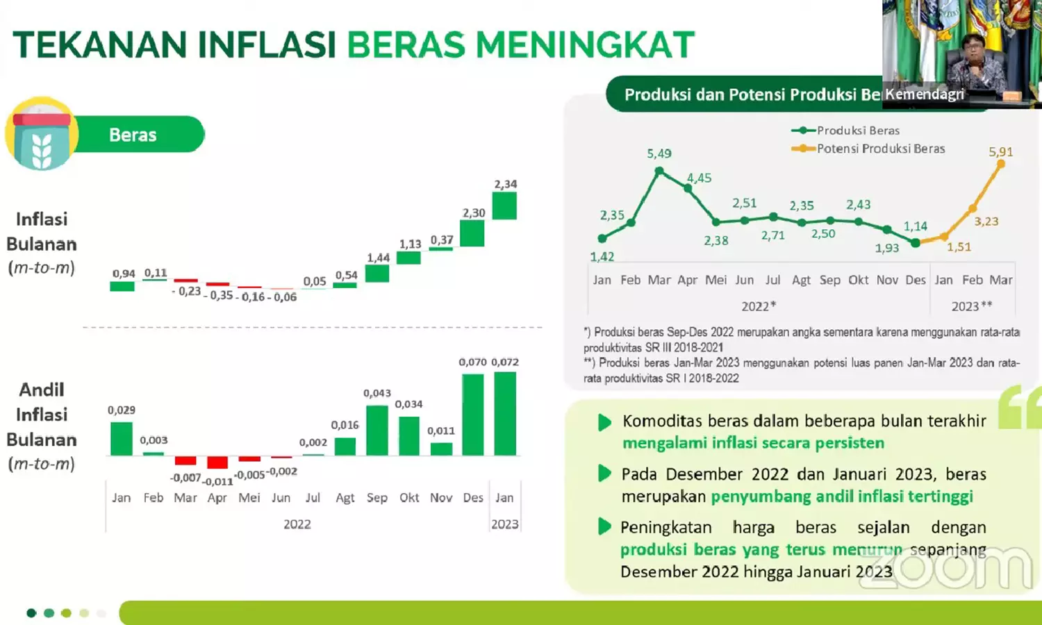 “Angka terakhir di bulan Januari 2023 inflasi beras mencapai 2,34 persen ini lebih tinggi daripada Desember sebesar 2,30 persen dan lebih tinggi daripada bulan November yang inflasi berasnya hanya 0,37 persen. Jadi tren harga beras sampai dengan Januari ini mengalami peningkatan,” kata Margo.
