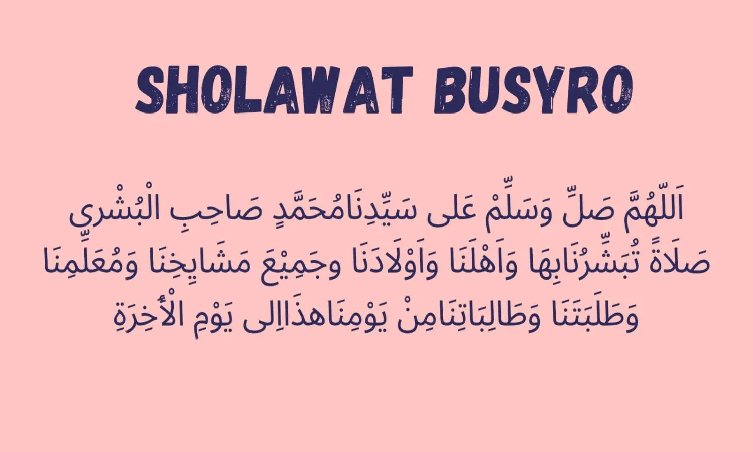 Sholawat busyro latin: "Allahumma Sholli wa sallim ala sayyidina muhammadin sohibil busyro sholatan tubassiruna bihaa wa ahlana wa awlaadanaa wa jamii’a masya’khinaa wa muallimiinaa wa tholabatanaa wa tholibatinaa min waumina hadza ilaa yaumil akhiroh."