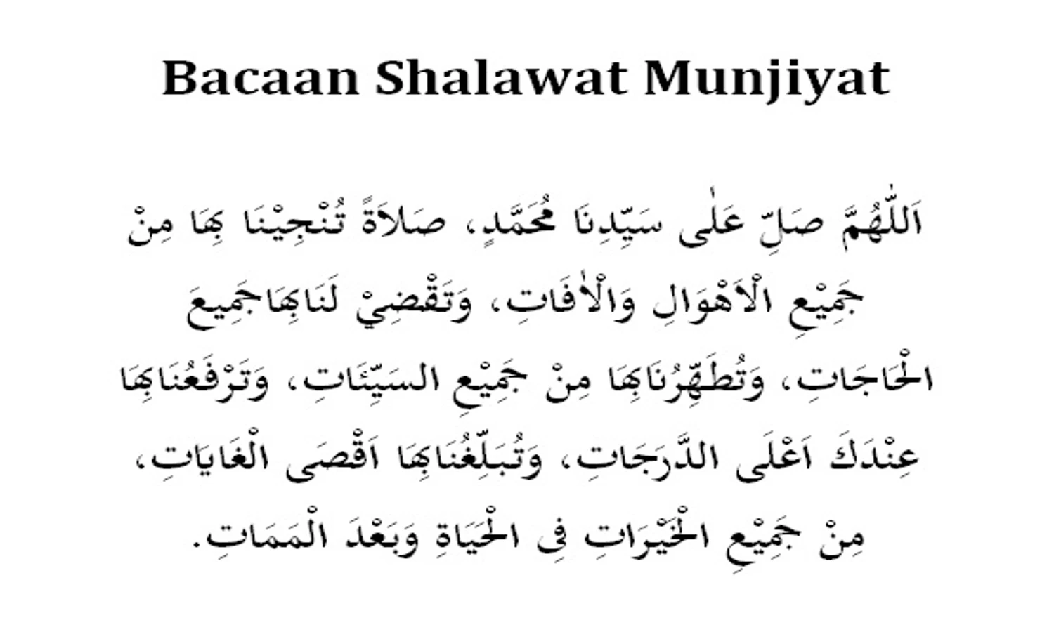 “Allahumma shalli ‘ala Sayyidina Muhammadin wa ‘ala ali Sayyidina Muhammadin shalatan tunjina biha min jami’il ahwali wal afat taqdhi lana biha jami’al hajat wa tuthahhiruna biha min jami’is sayyiat wa tarfa’una biha ‘indaka a’lad darajat wa tuballighuna biha aqshal ghayat min jami’il khairati fil hayati wa ba’dal mamat.