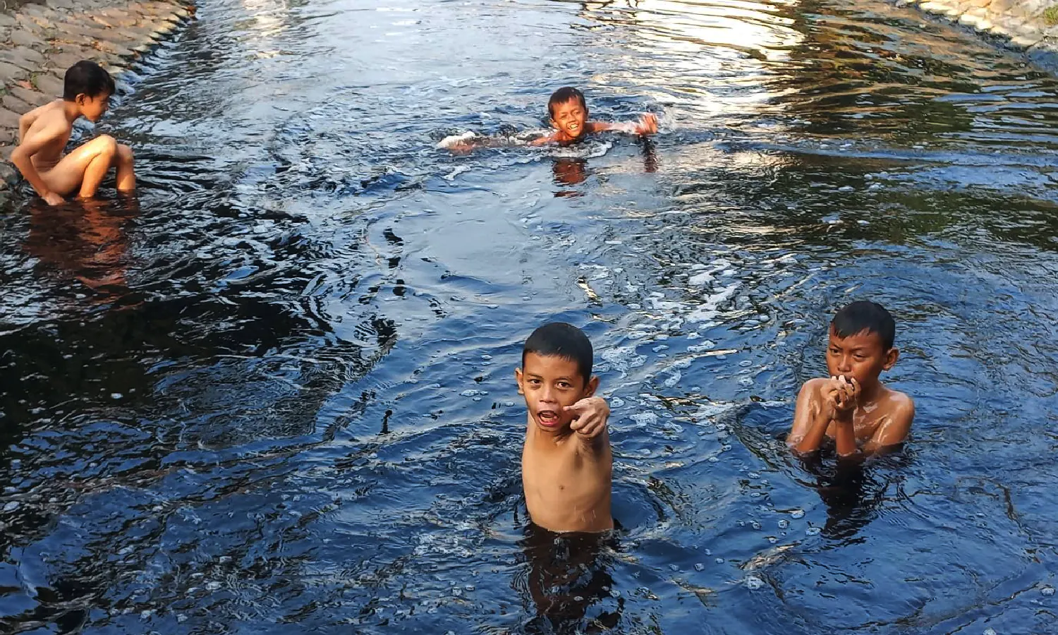 PARBOABOA – Suara tawa lepas yang sesekali diiringi bunyi cipratan air terdengar jelas dari Sungai Cilemahabang, Kabupaten Bekasi, suatu sore medio Agustus lalu. Di tengah sungai yang airnya hitam pekat itu, Kewin (12) bersama tiga temannya tengah asyik berenang.