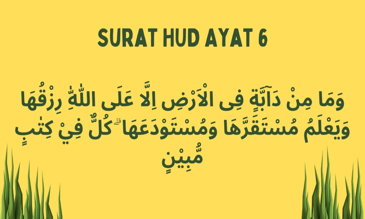 Surat Hud ayat 6 Latin: Wa mÄ min dÄbbatin fil-ará¸i illÄ ‘alallÄhi rizquhÄ wa ya‘lamu mustaqarrahÄ wa mustauda‘ahÄ, kullun fÄ« kitÄbim mubÄ«n(in).