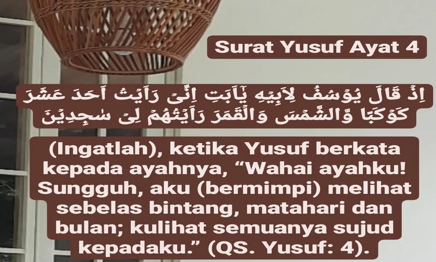 Artinya: (Ingatlah), ketika Yusuf berkata kepada ayahnya, “Wahai ayahku! Sungguh, aku (bermimpi) melihat sebelas bintang, matahari dan bulan; kulihat semuanya sujud kepadaku.” (QS. Yusuf: 4).