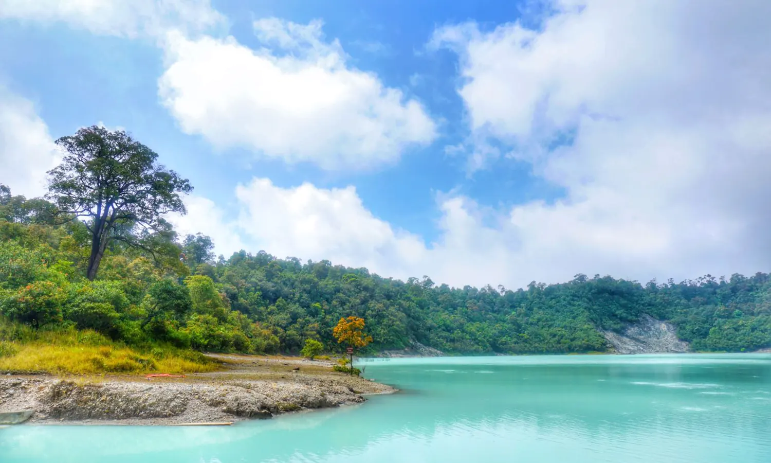 Saat tiba di wisata ini, kamu disambut sebuah kawah atau danau dengan warna biru yang agak keputihan.