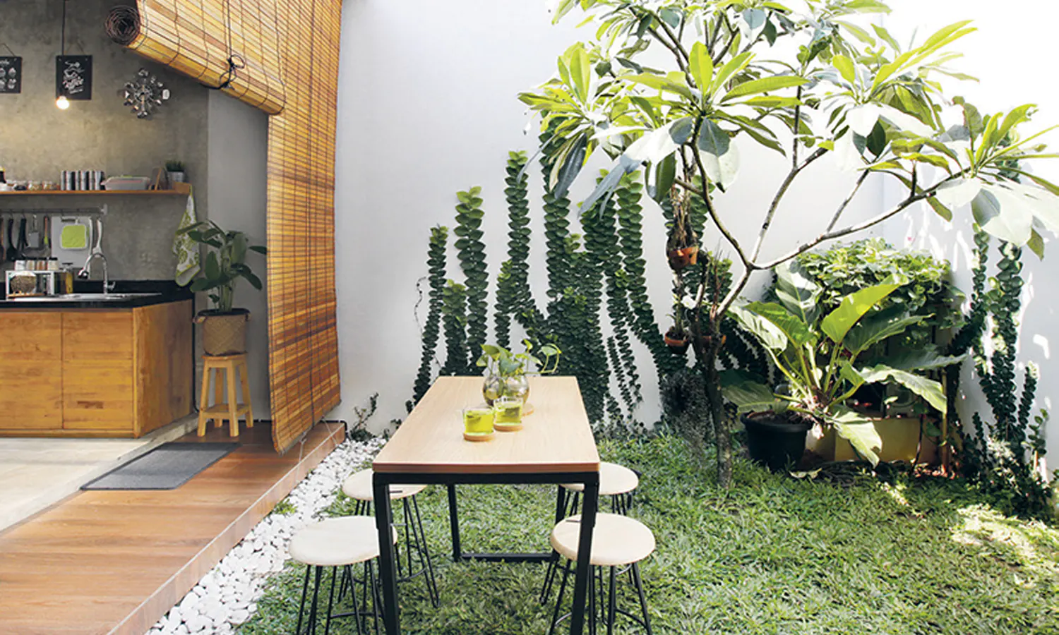 6. Ngafe di Taman Dalam Rumah Dekat Dapur Modern