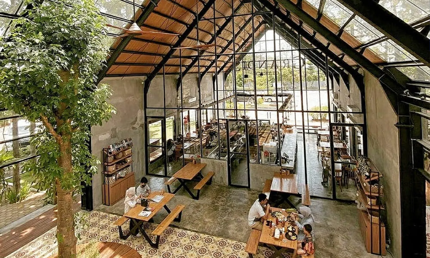 Tempat nongkrong di Solo ini mengusung ide arsitektur barn ala Eropa yang instagramable. Area indoor cafe ini sangat luas hingga capai 800 meter persegi, sehingga cocok untuk berkumpul beramai-ramai.