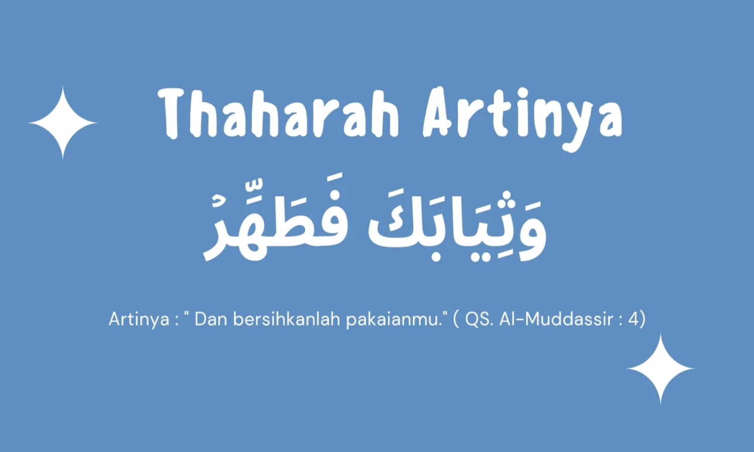 Thaharah artinya bersuci dari najis dan hadas. Dalam Islam thaharah mempunyai kedudukan yang sangat penting khususnya sebelum menunaikan ibadah shalat.