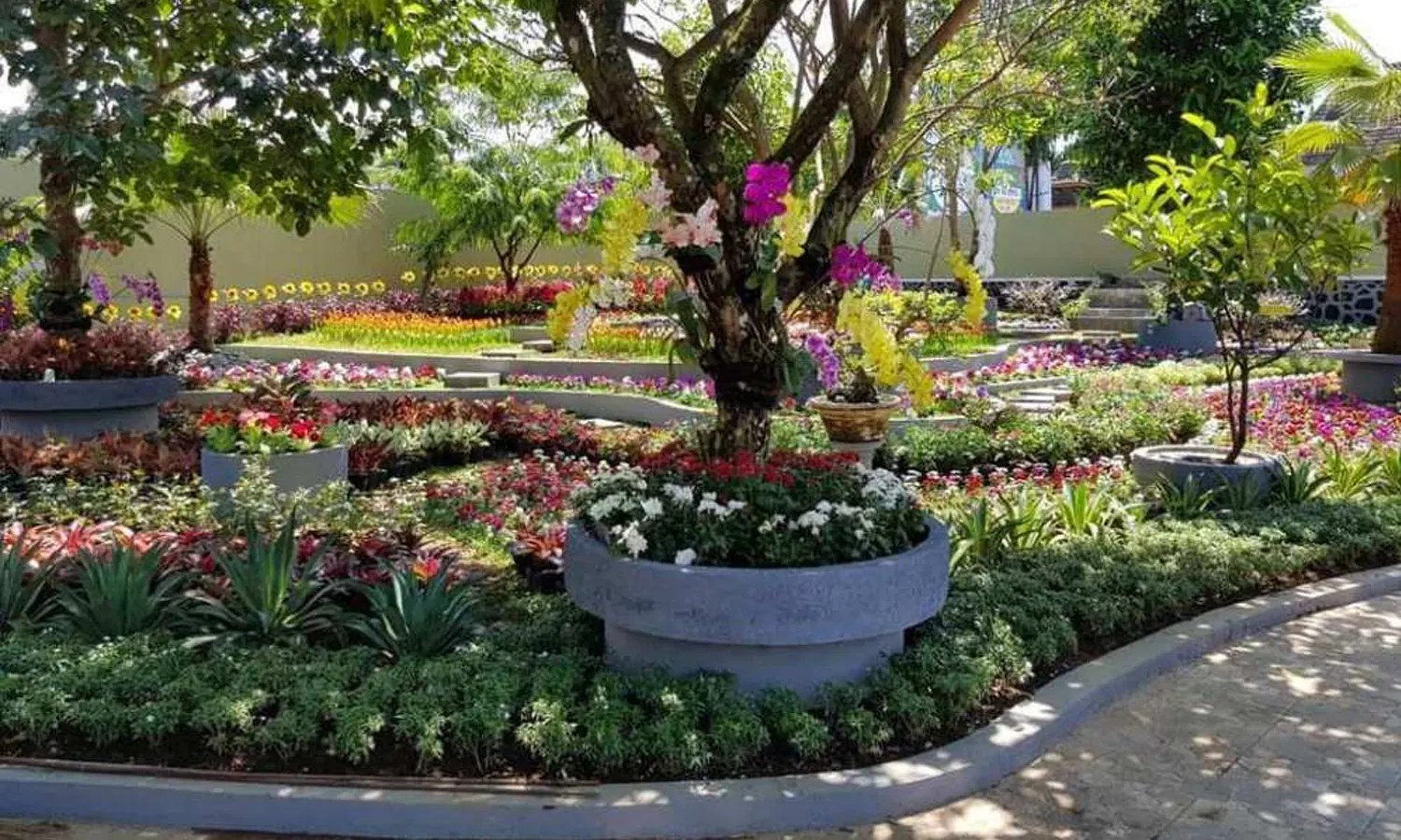 Objek wisata buatan ini dipenuhi tanaman yang asri dan bunga sintetis yang beragam sehingga membuat suasananya lebih sejuk.