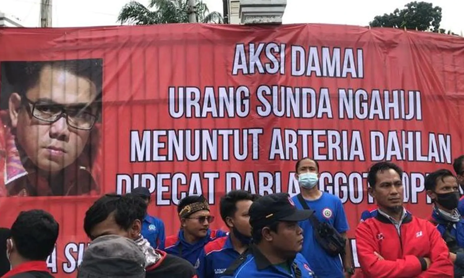 Di sana, mereka turut membentangkan sebuah spanduk yang berisi gambar wajah Arteria Dahlan dengan tulisan ‘Aksi Damai Urang Sunda Ngahiji Menuntut Arteria Dahlan Dipecat dari Anggota DPR RI’.