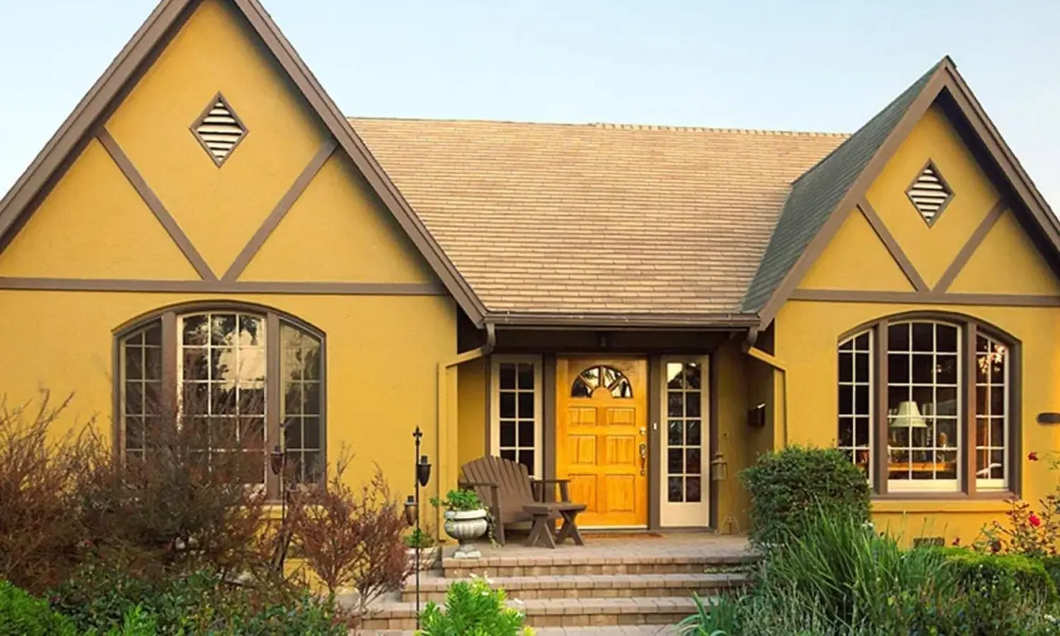 Ini termasuk pemilihan warna cat dinding luar rumah yang cerah lho. Pada inspirasi ini, kamu bisa mengombinasikan warna kuning mustard pada dinding dengan aksen cokelat pada pintu dan kursi malas di teras untuk kesan kontemporer.