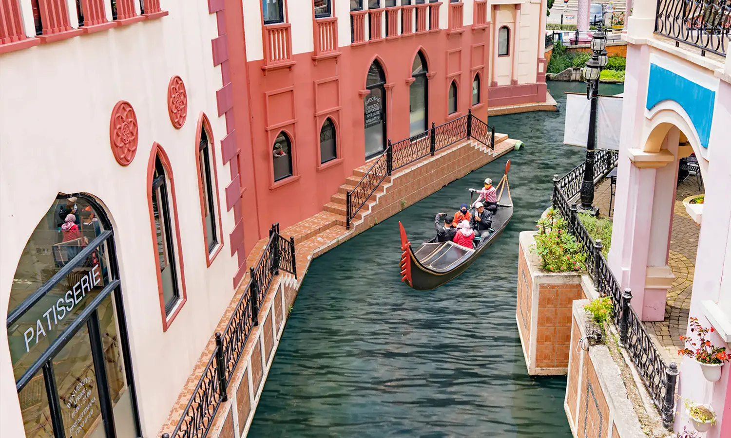 Di sini, kamu akan menemukan replika bangunan khas Eropa dan Asia. Karena mengusung tema ‘Venice’, tentunya ada aktivitas utama yang tidak boleh kamu lewatkan, yakni menyusuri kanal menggunakan gondola.