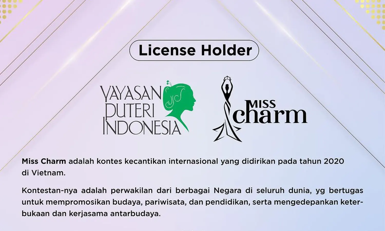 PARBOABOA, Jakarta – Setelah putus hubungan dengan ajang Miss Universe, Yayasan Puteri Indonesia (YPI) kini akan mengirimkan wakilnya ke panggung kecantikan Miss Charm. Melalui akun resminya di Instagram, YPI menyatakan bahwa mereka adalah "License Holder" Miss Charm.